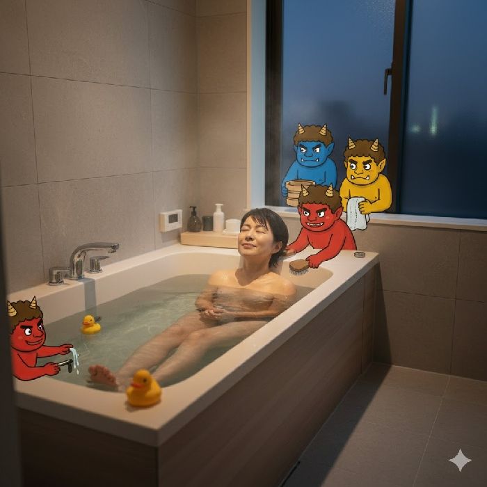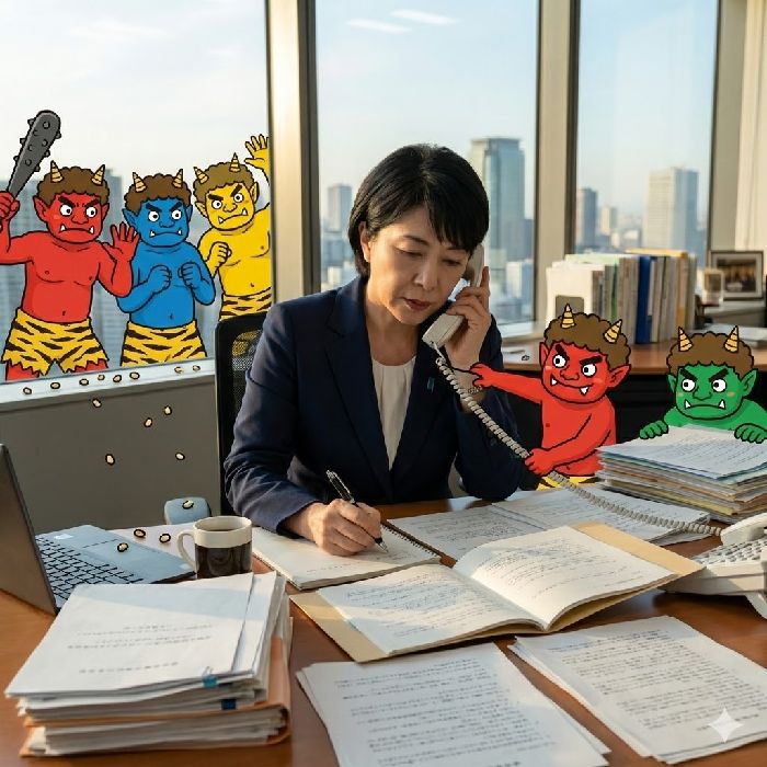 今年も節分がやってきました、「鬼たちと一緒に、働いて、働いて、働いてる女性」を