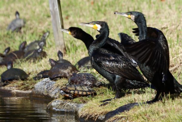 鵜もカメも~ 陽の射す方向いて~((´∀`))ケラケラ」